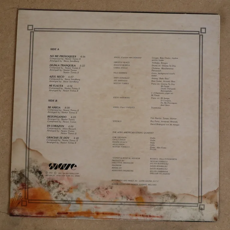 Check the deep latin jazz fusion "azul seco" on this otherwise excellent crossover charanga / latin jazz fusion descarga masterpiece by the Colombian flutist. Sleeve has small peel off on front, large orange & beige water damage wear & moisture residues on back, creases, record in amazing shape.
