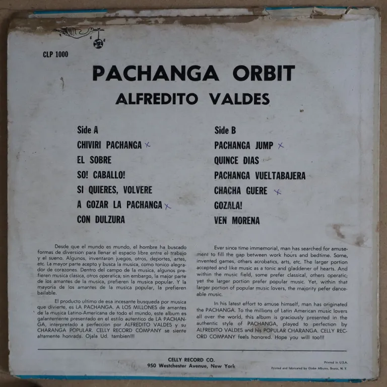 "Chacha guere" "So ! caballo ! " & more excellent pachangas. Sleeve w/ aging & wear, split along all top, 3" split on bottom, writings, air bubble & peel off on back, Record has light to hardly noticeable noise only despite some visible marks.