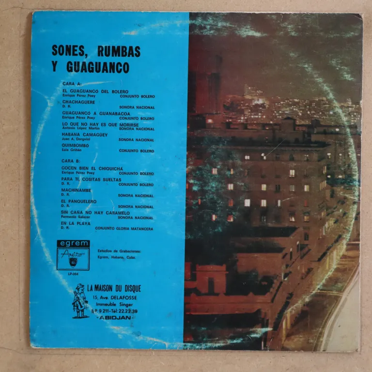 Afrocuban sounds on top on this scarce compilation specially released with Areito for the African market by an Ivory Coast producer. Features exclusive tracks & previously released material. Tracklisting : Conjunto bolero "el guaguanco del bolero" "guaguanco a guanabacoa" "quimbombo" "gocen bien el chiquicha" "para ti, cositas sueltas". Sonora nacional "chachaguere" "lo que no hay es que morirse" "habana camaguey" "machinambe" "el panquelero" "sin cana no hay caramelo". Conjunto Gloria Matancera "en la playa". Sleeve has ringwear, small peel off on top, light aging, dirt, shop sticker on front, writings on labels, record has very light to hardly noticeable noise, VG to VG++ depending on parts.