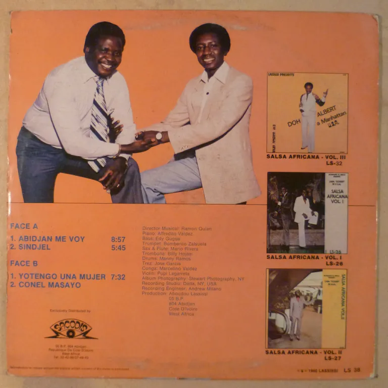 Solid dancefloor salsa tunes by Laba Sosseh on one of his best records, light aging & dirt, large writings on front & labels, record plays greatly.