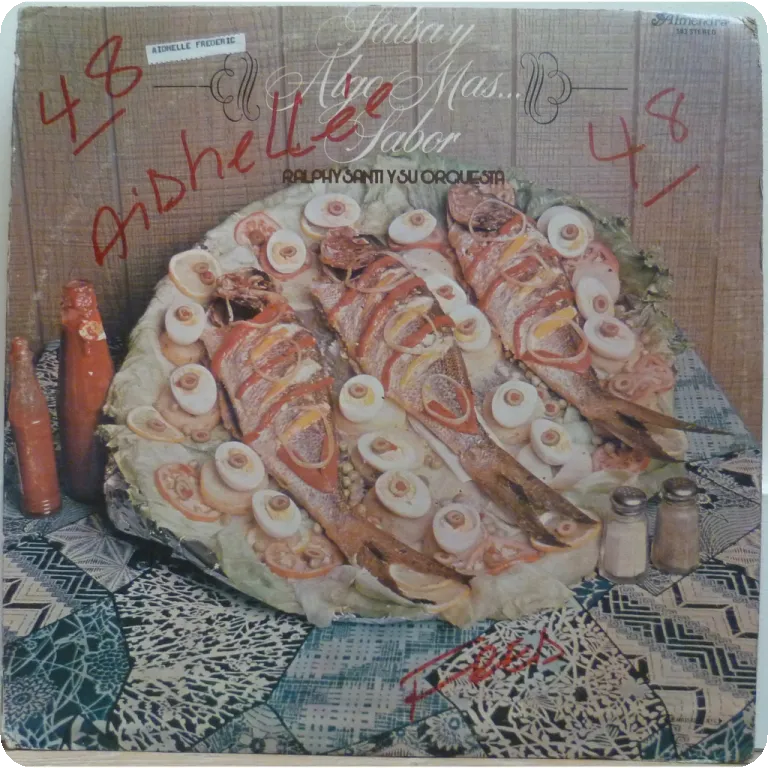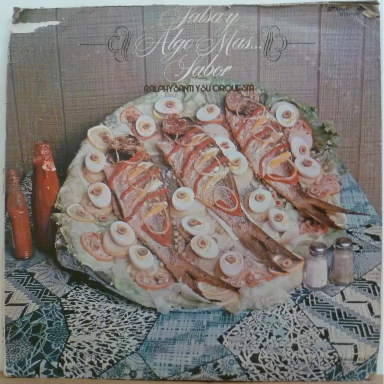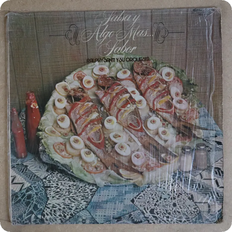 Dancefloor salsa & salsa tipica tunes, bite on top mouth corner, split on all top & bottom, sticker & strong dirt & writing on back, large writings on labels, plays w/ constant reasonable to light