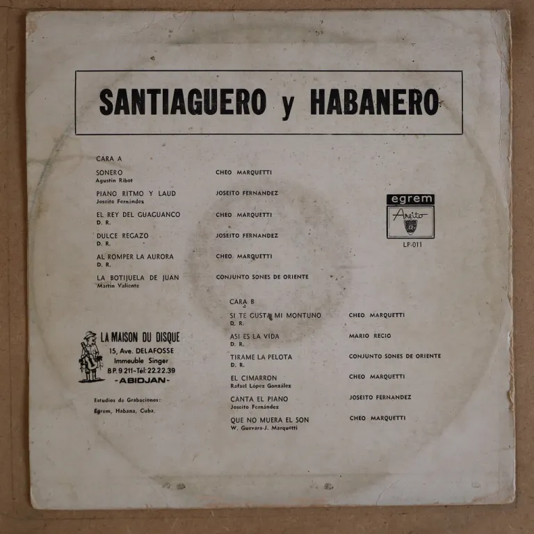 Cuban sones & other rhythms on top as released on this scarce Areito LP 011 which also includes Conjunto Sones de Oriente & Mario Reco. Produced by Ivory Coast producer from old 60's Areito material. Wear on cover, strong ringwear, split on all spine, shop sticker on front, fading of the colour, writings on cover & labels, distributor sticker on back, record has marks & light to hardly noticeable noise, solid VG to VG+