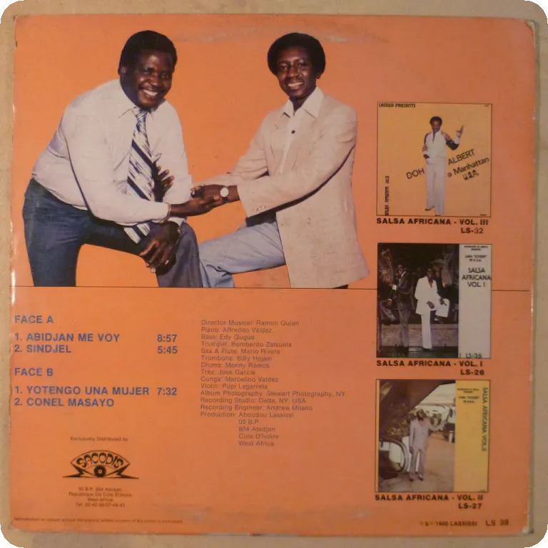 2 Cuban style montuno winners sung in wolof & Spanish by the Senegambian leader, sleeve has some aging & dirt, writings on back & A side label, record has light to very light noise from numerous light marks, very solid VG- to solid VG depending on parts.