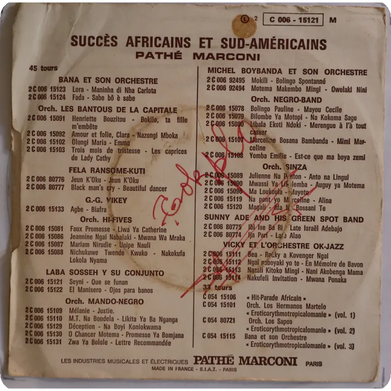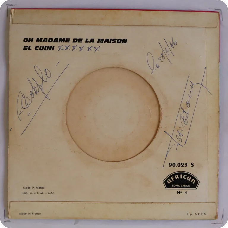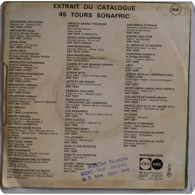A down tempo son montuno Cuban style and a soul ballad as recorded by this obscure singer apparently from Benin. Sleeve w/some aging & dirt, writings along top on back.Record is VG+ w/ some warp but no sound distortion nor surface noise from thin marks.
