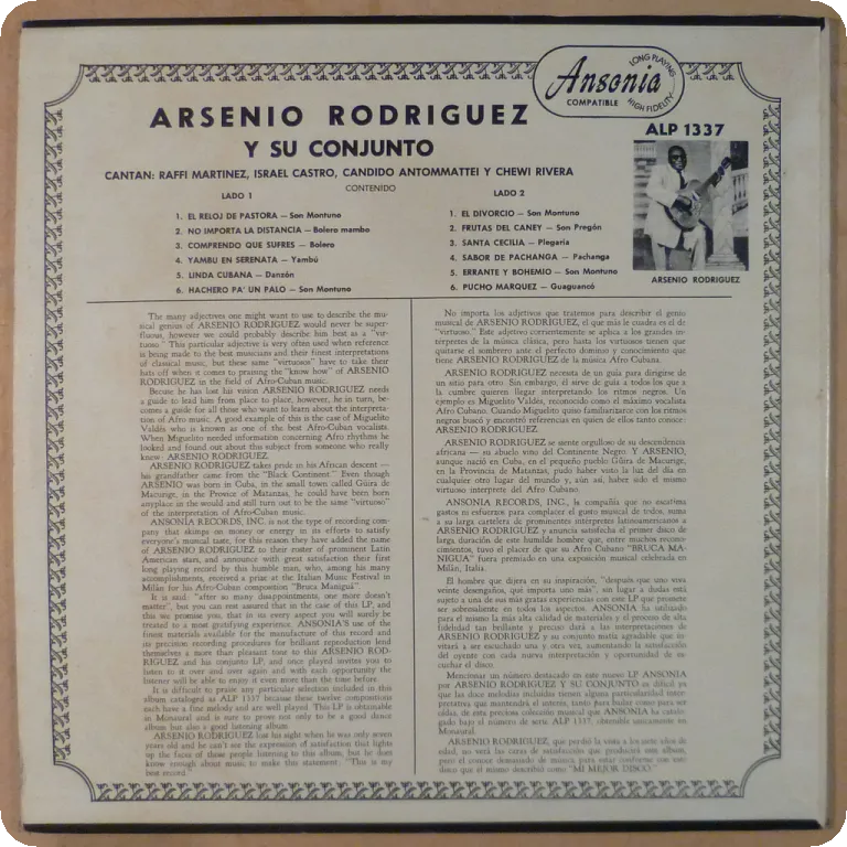 Acoustic guitar son music from Oriente, mostly Miguel Matamoros compositions, El que siembra su maiz, Lagrimas negras, Pobre Bohemia. Ramsa distributor cover, vinyl has 1962 cutting date engraved in