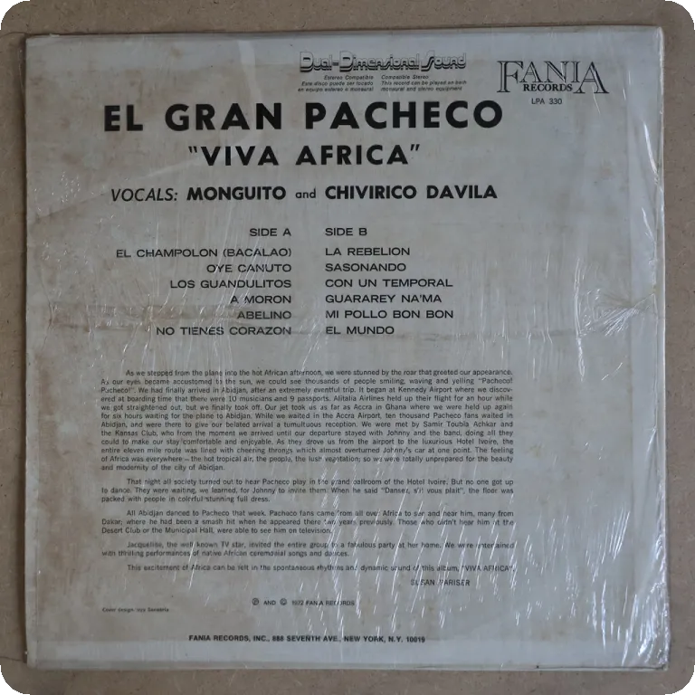 Several dancefloor winner guarachas & excellent guajiras & sones on this classic LP, sleeve is in OG shrink and has dirt wear, large glue residue & light brown water damage on front, record plays w/