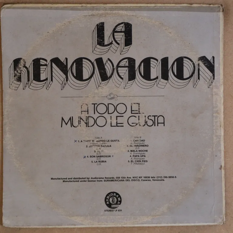 Very consistent Venezuelan salsa LP. Wear on cover, peel off & large writings on cover & labels, 10" split on bottom, vinyl plays nicely most of the time despite marks, only light clicks on all B2 "el