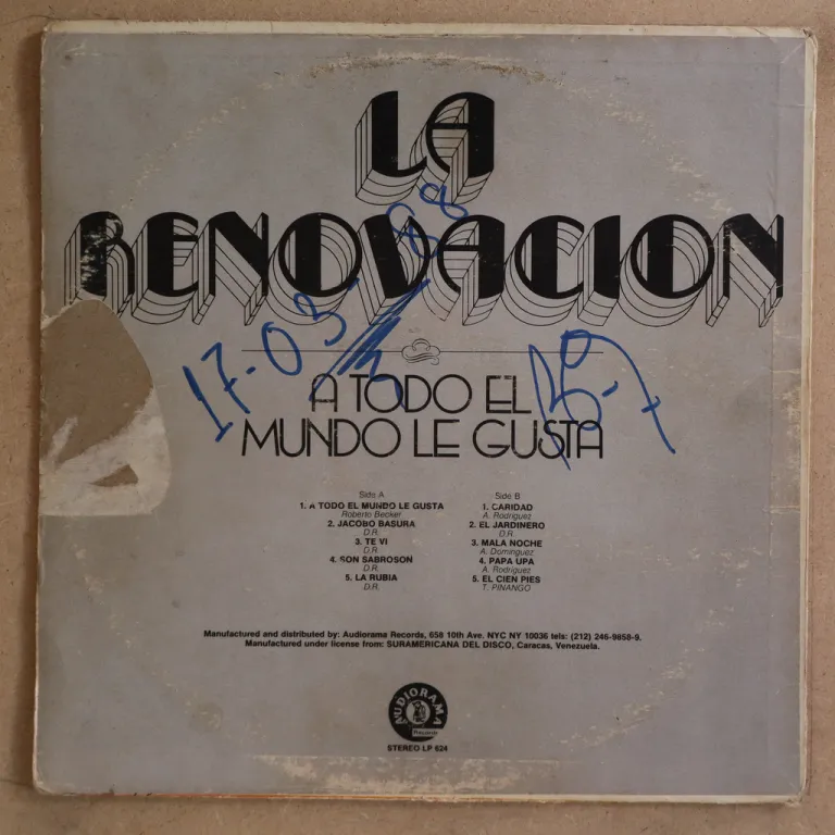 Very consistent Venezuelan salsa LP. Wear on cover, peel off & large writings on cover & labels, 10" split on bottom, vinyl plays nicely most of the time despite marks, only light clicks on all B2 "el jardinero" which is not a standout.