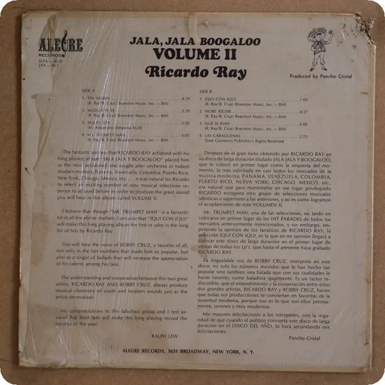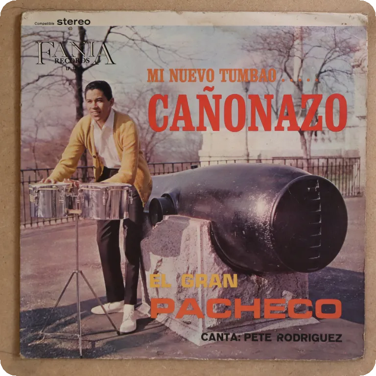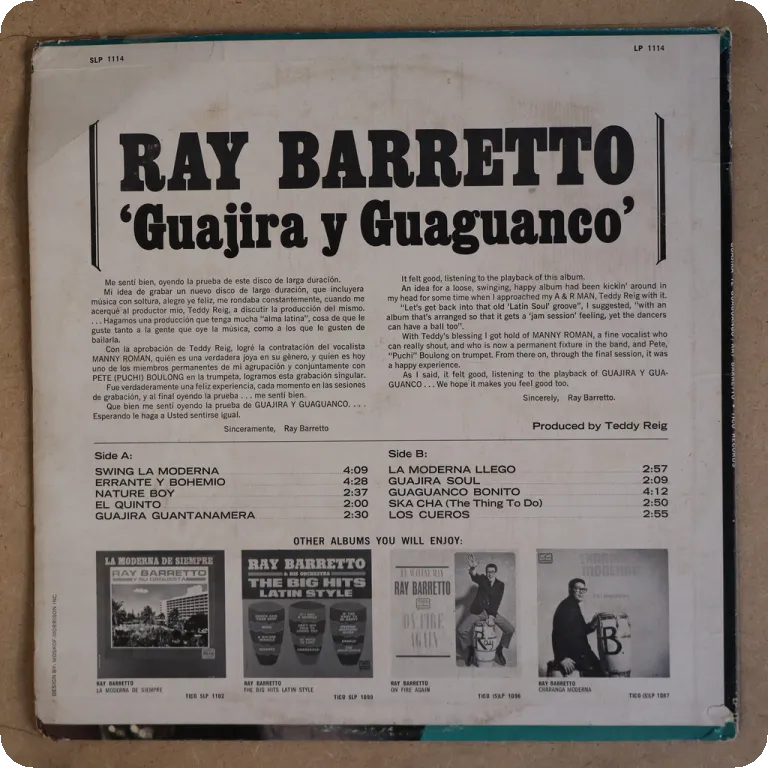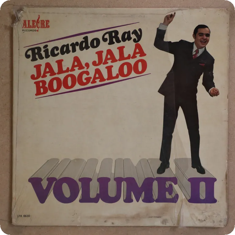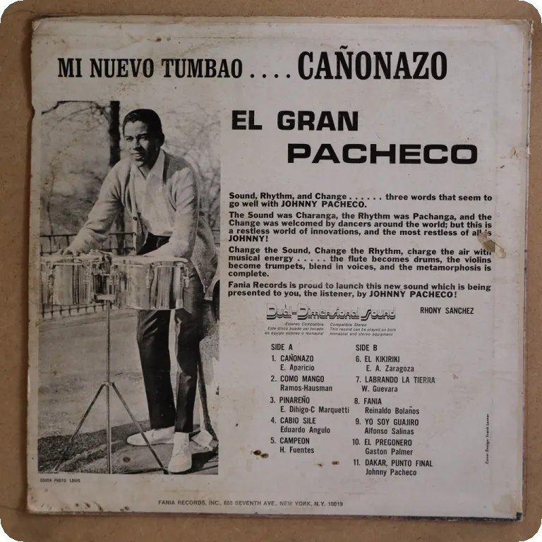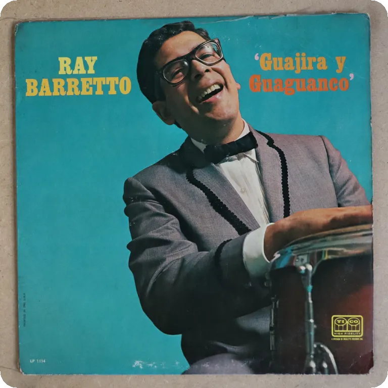 Descarga masterpiece tunes + 2 boleros, a guajira & a guaguanco percussion Cuban style, sleeve has aging & dirt, split on all top & bottom seams, large beige water damage, small peel off, record has marks & very light noise to almost no noise depending on parts