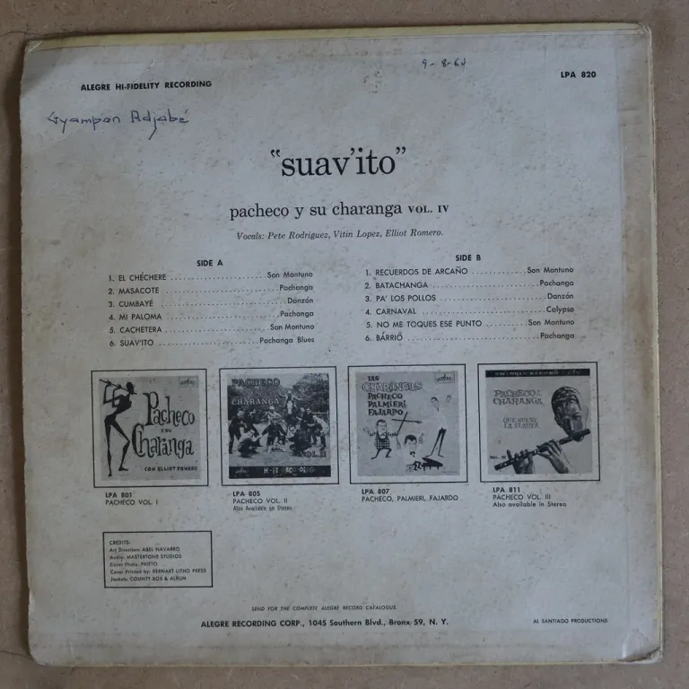 Must have all times classic charanga by the flute master & director,features excellent sones & pachangas all through. Sleeve has some aging & dirt, creases on mouh corners, writings on back, record has numerous marks & constant reasonable to very light noise, VG- to VG depending on parts.