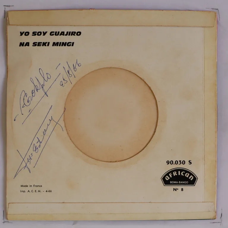 A guajira cha cha cha & a rumba on this mega scarce Congolese release, dirt wear on cover, writings on back & A label, record has very reasonable to light noise from marks.