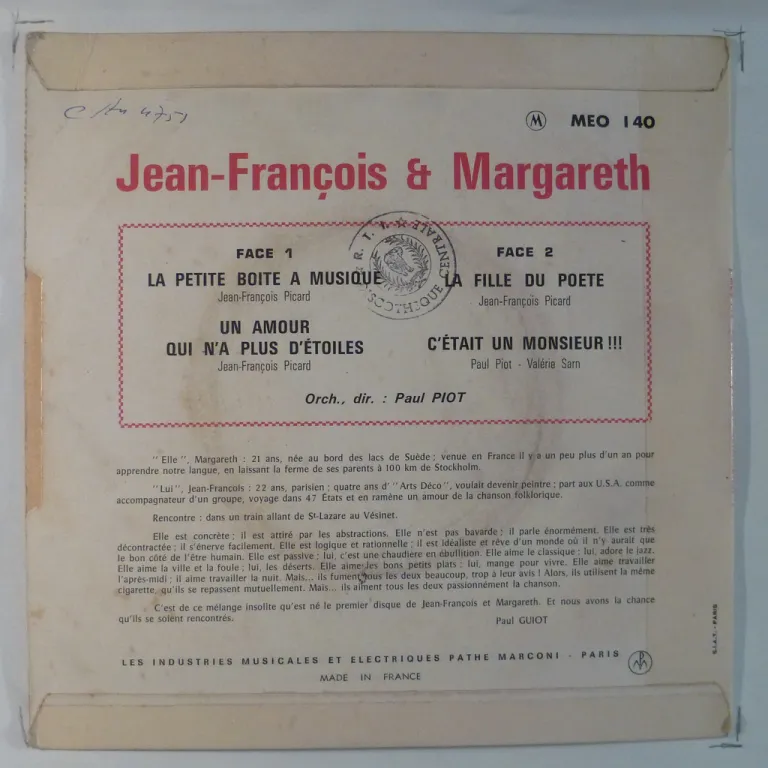 JEAN FRANCOIS & MARGARETH - La petite boite a musique / Un amour qui n'a plus d'etoiles / La fille du poete / C'tait un monsieur