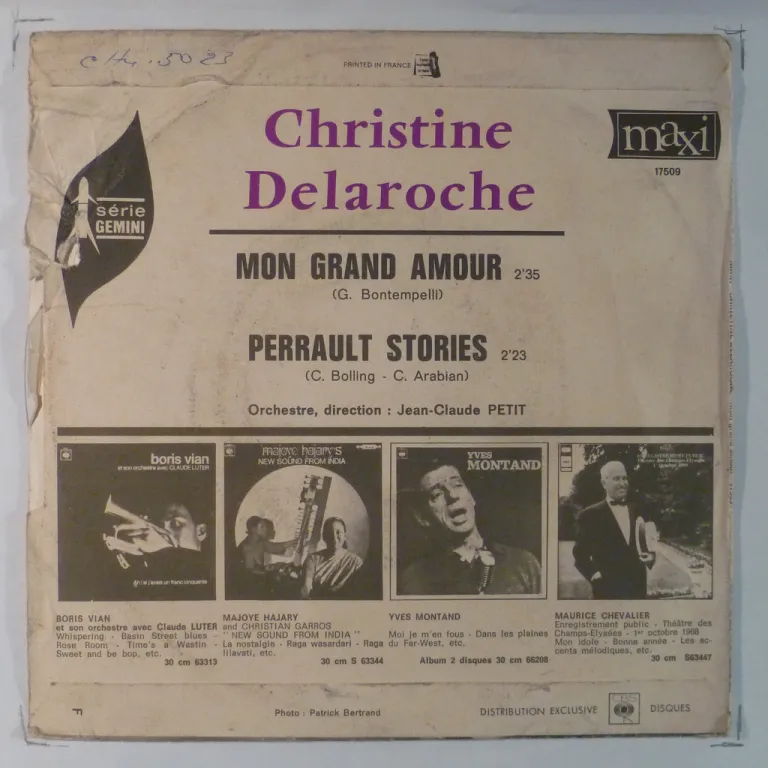 French bossa bova / samba tune. Aging & dirt, bump on mouth & mini tear, sticker on front, rubber stamp on cover, writings on cover & labels.