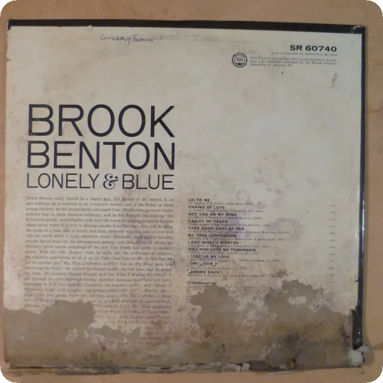 Soul, rhythm 'n blues & blues by the crooner, sleeve has strong wear, peel off, warp, paper stuck, light brown water damage, crackling & tears along bottom, plays sweetly most of the time with a few