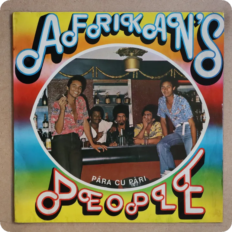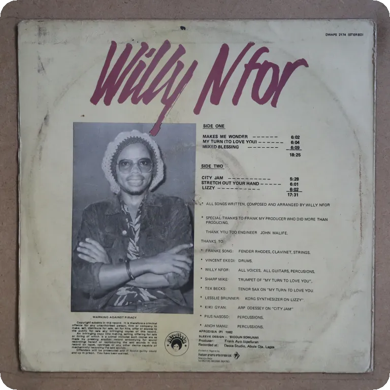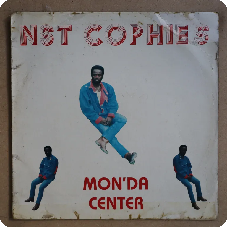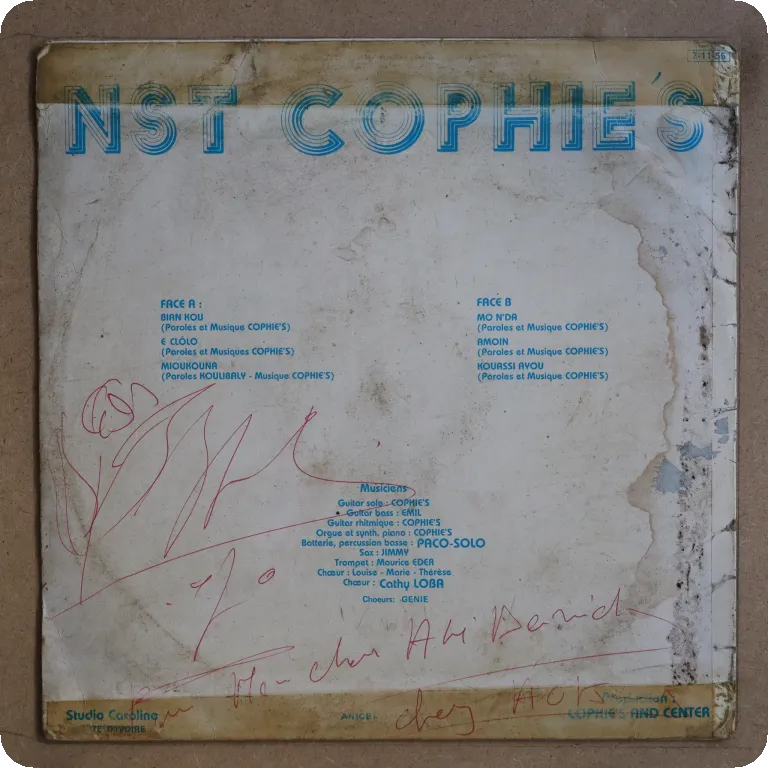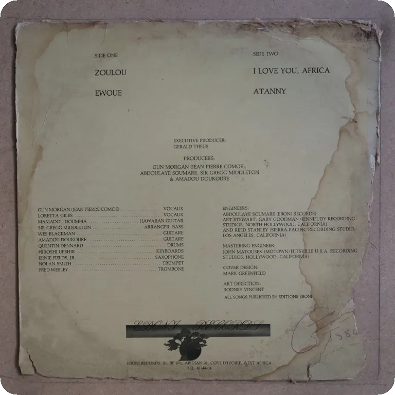 Boogie disco from Africa, self produced. Sleeve has aging & dirt wear, creases, large writings on back, large beige water damage, glue residues along top & bottom visible mainly on back, mini peel off