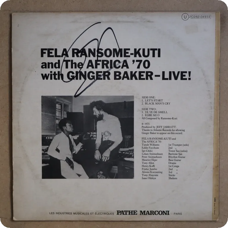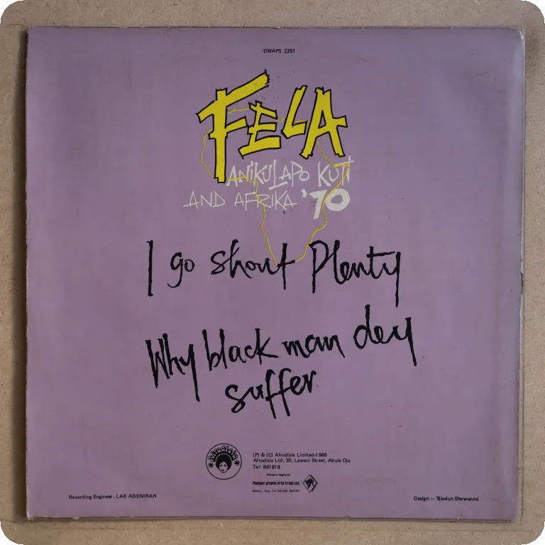 2 afrobeat tunes recorded in '77 and released for the first time on this pressing, light wear on cover, mini tear on mouth, mini peel off on A side label, plays with light to hardly noticeable noise