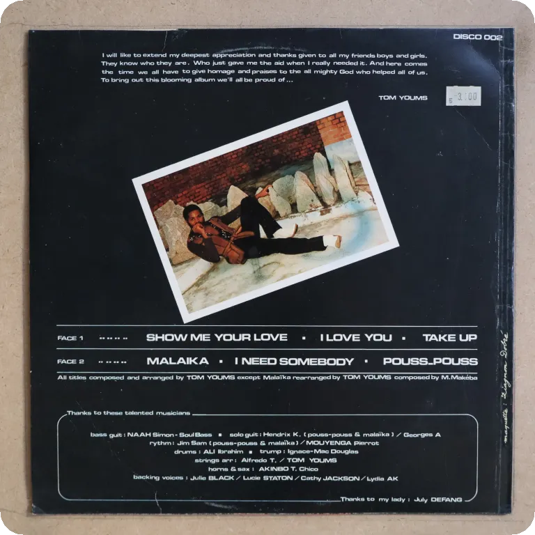 Afrosynth disco by the Cameroon singer, feat. "Show me your love" & "take up". Sleeve has minor wear, large writings on labels, record plays with light to hardly noticeable noise only despite marks