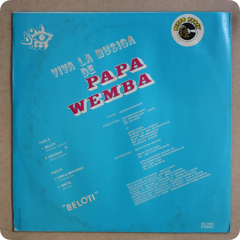 Highly indemand heavy danceable soukous ultimate masterpiece by the Congo legends on an extremely rare private press, shop sticker on front, price sticker on back, plays sweetly, looks superb.