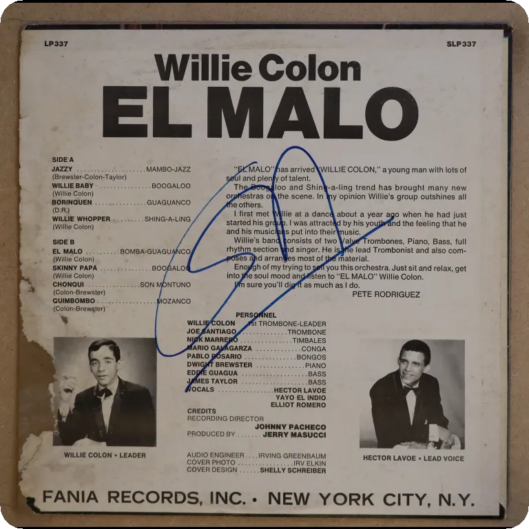 Hard guaguancos, boogaloo & descarga jazz tracks on this outstanding debut LP by salsa's bad boy. Fania clouds label stereo. Sleeve has peel off along mouth, large writings on back, record plays