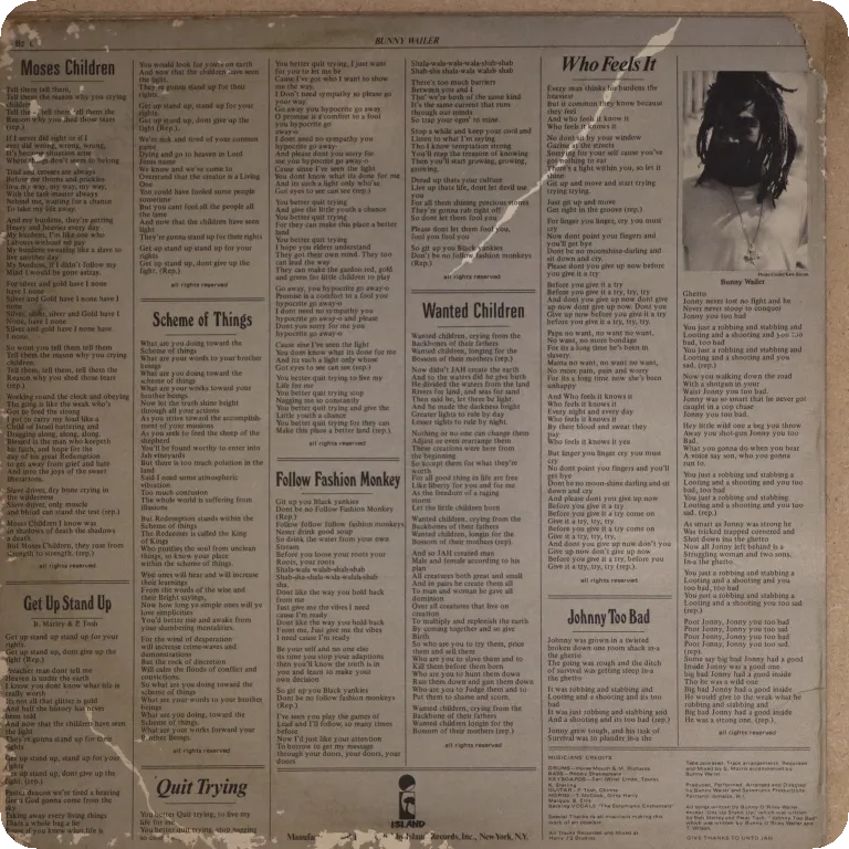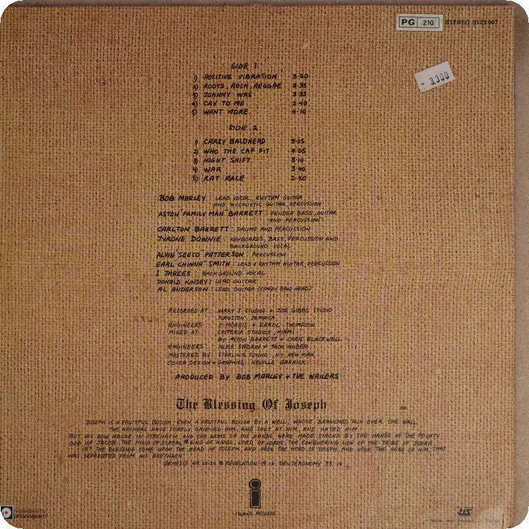 Classic must have feat. Africa unite, So much trouble in the world, title tune, Zimbabwe, etc. Comes with original insert. Plays very nicelly despite light marks.