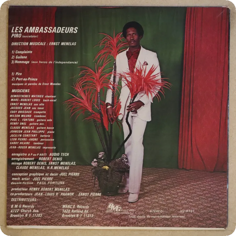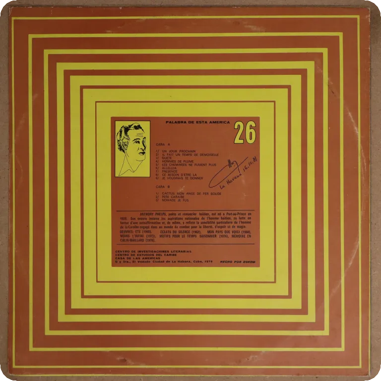 Spoken word poetry recordings of this 20th century Haiti poet. sleeve has light aging & dirt, small writings & some ringwear on back, record has very light to hardly any noise.