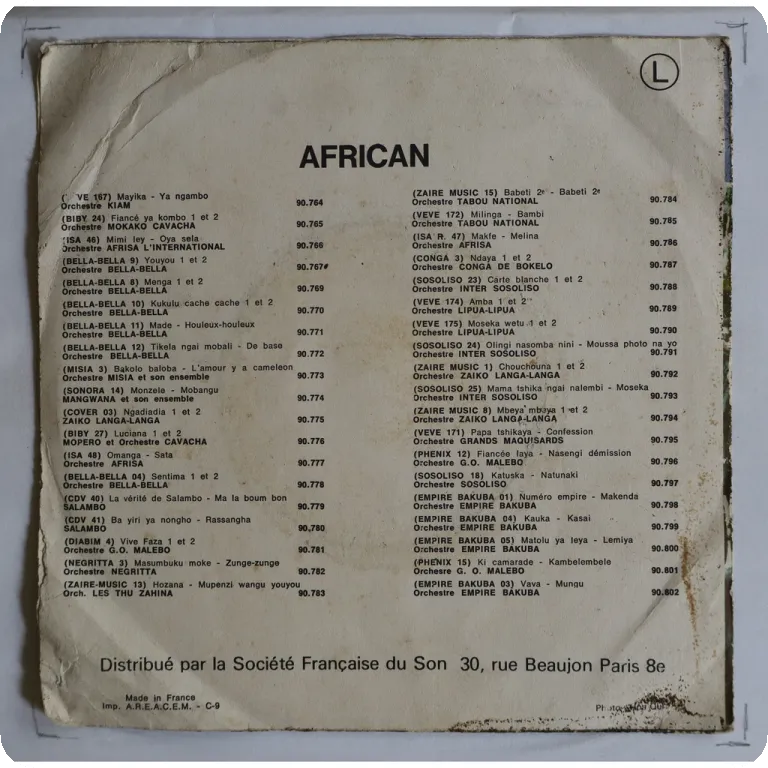 Mid tempo soukous rarity from Congo. Some dirt on labels. Reasonable to hardly noticeable noise from marks, varies from VG- to VG+ depending on part.