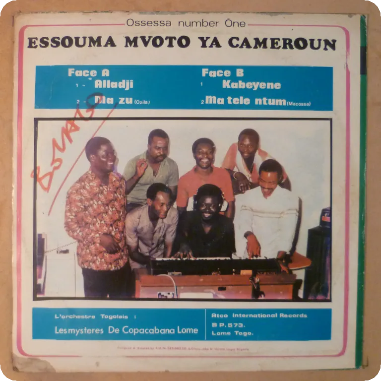 Tropical dancefloor soukous winner at title tune and a hypnotic rumba on this scarce afro pop LP recorded in Togo by Cameroon singer, backing by obscure Mysteres de Copacabana group, sleeve has some