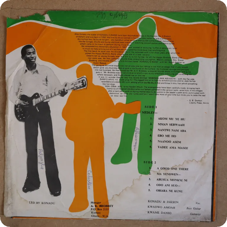 Consistent Ghanaian highlife LP, sleeve has aging & dirt, glues residues along spine & bottom, light brown dirt stains & writings on lalbels, record plays solid VG- to VG, very reasonable to very