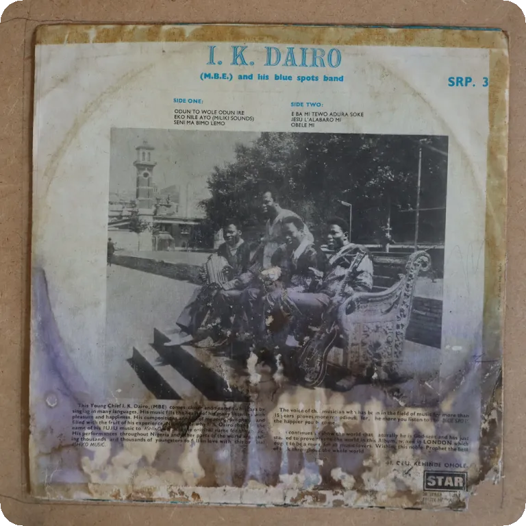 Killer Nigerian highlife by the Yoruba multidisciplinary genius. Wear & dirt on cover, discolouration along spine on front, bumps & small peel off along mouth, creases. Record plays nicely VG to VG+
