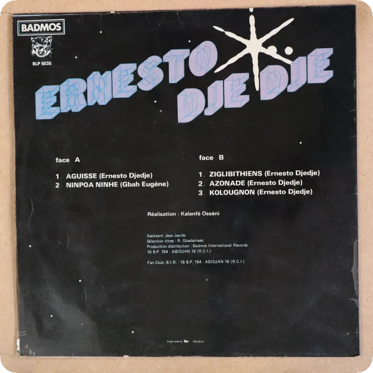Hypnotic afro synth & soukous from Ivory Coast on this scarce private production, sleeve has dirt wear & light aging, writings on back & labels, record has about 10-15 clicks on A1 otherise plays