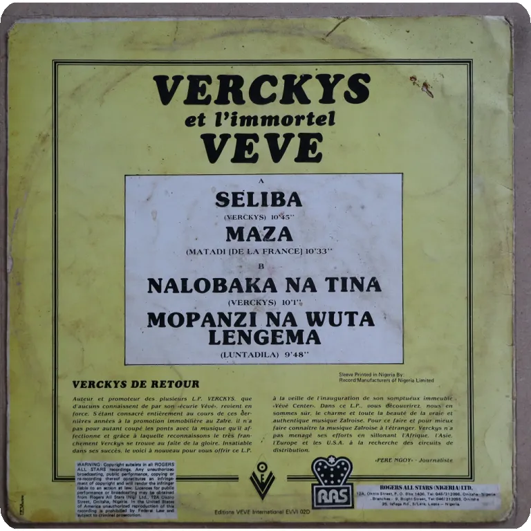 Killer tropical dancefloor soukous synth winner tune on this consistent Nigeria only lingala soukous Congolese music LP. Strong dirt & large peel off on back, some dirt on front, small writing on B