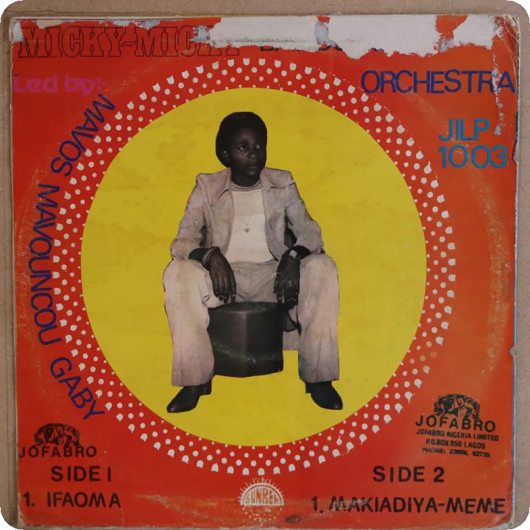 Congolese soukous 2 tracks masterpiece recorded in Nigeria, some aging & dirt on cover, peel off & light brown water damage along top, mini bite on spine, plays with noise on intros to sides as can be