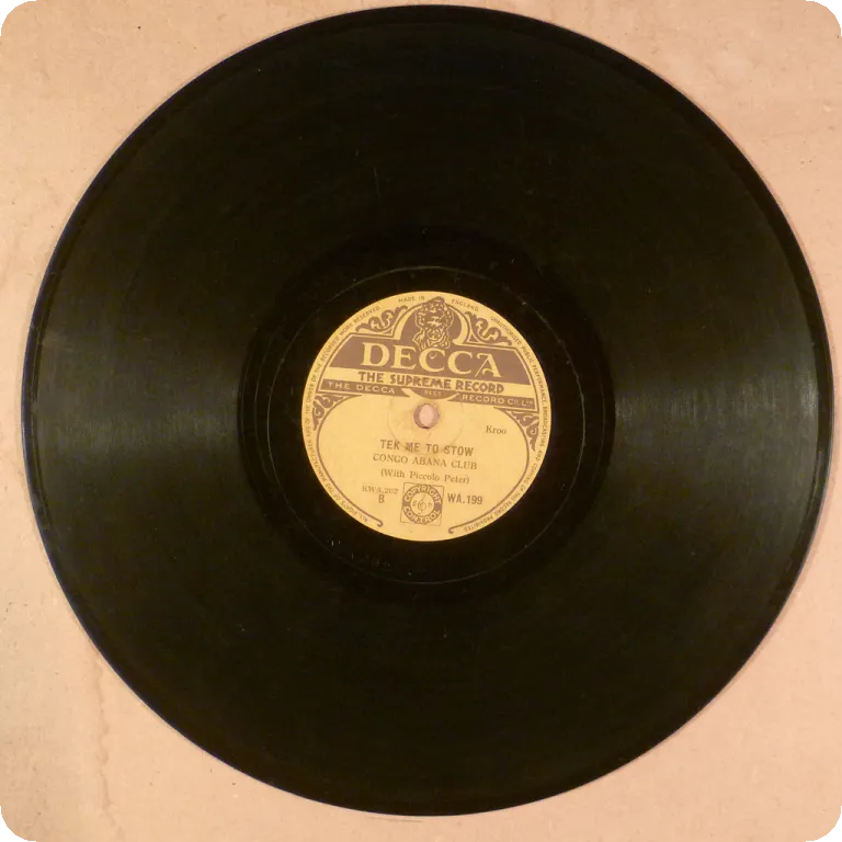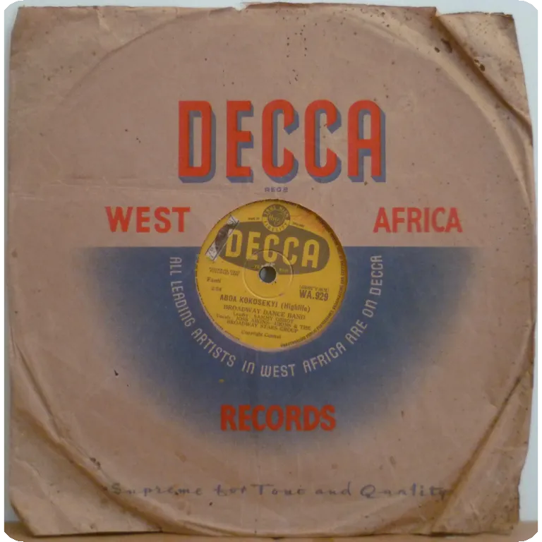 Ghana Horn highlife double sider by one of the country's leading groups of the genre. Apparently the very first release on 78rpm of tunes later compiled on their "Happy highlife" 1960 10" LP. Sleeve