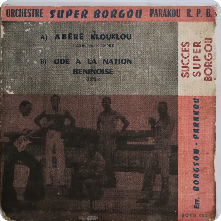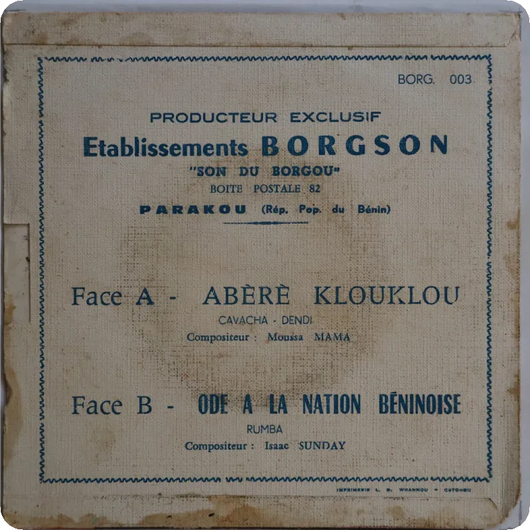 Northern Benin soukous / rumba double sider rarity, sleeve has aging & dirt, narrow bites on bottom spine & mouth, ringwear, beige stains, record has a few clicks on intro to A side otherwise only
