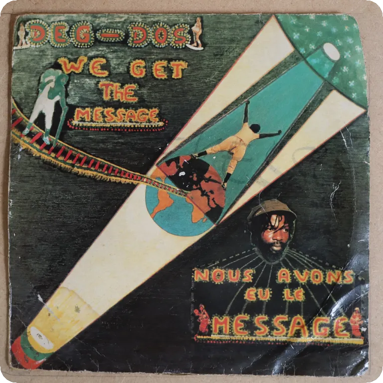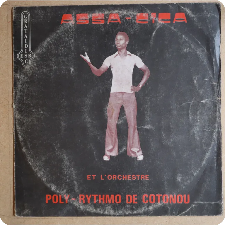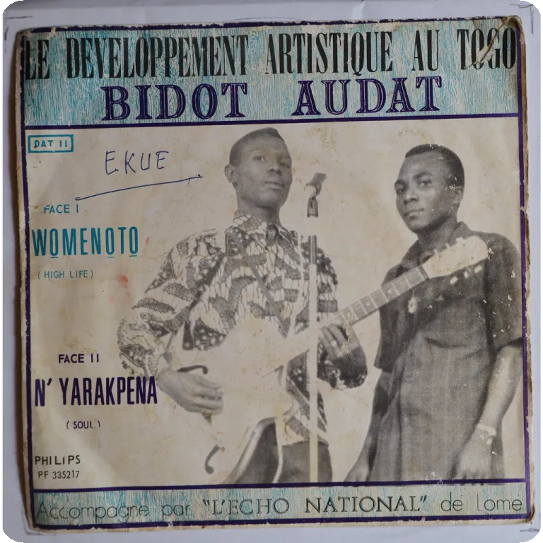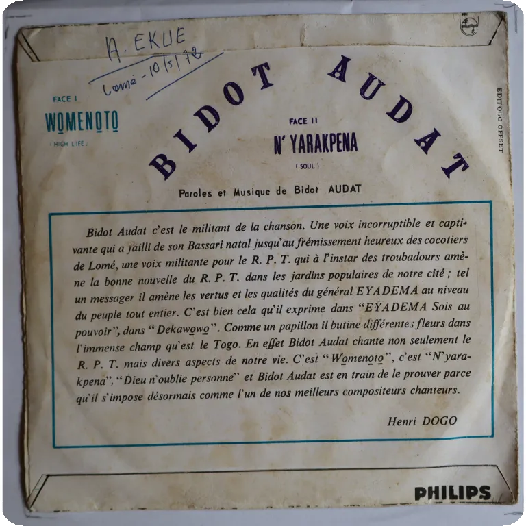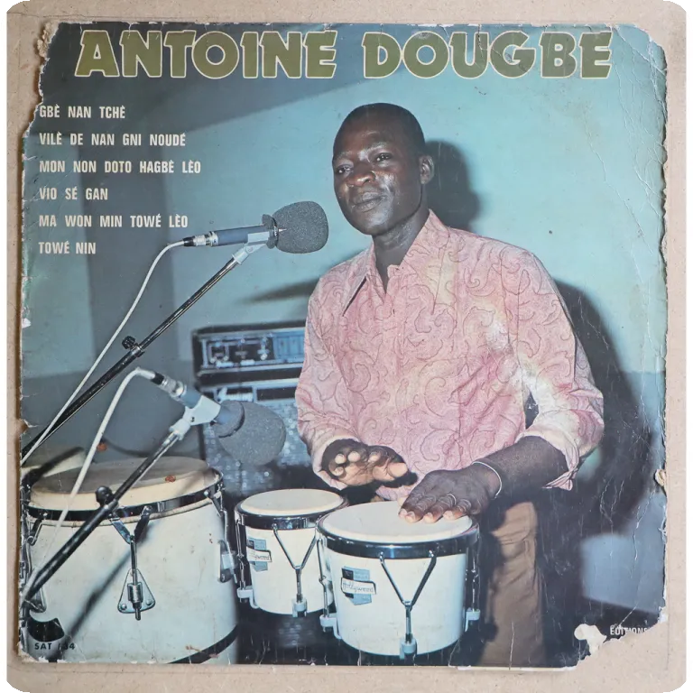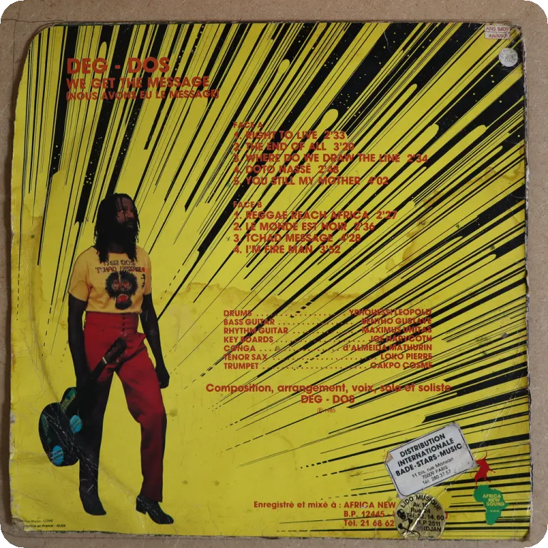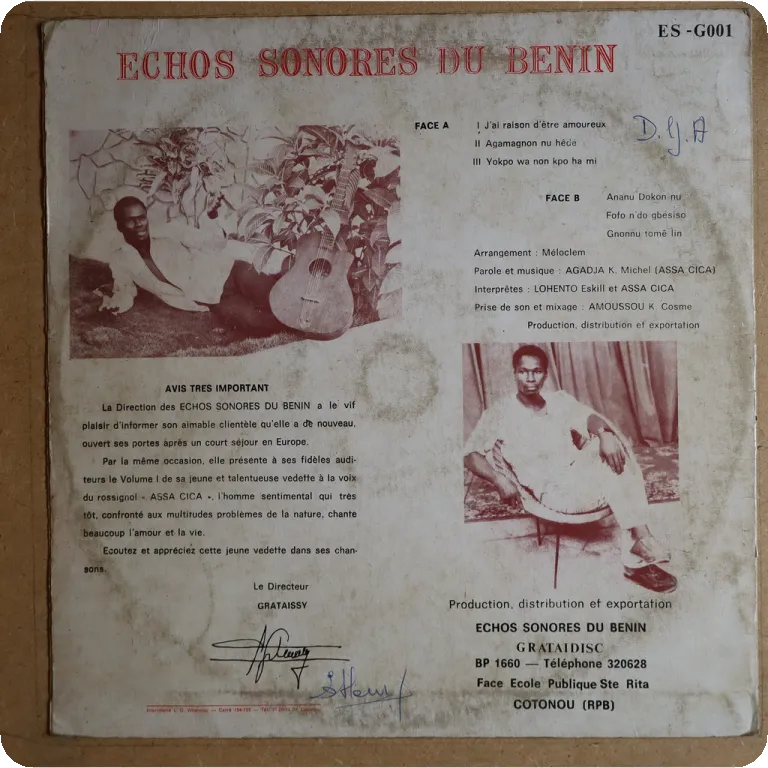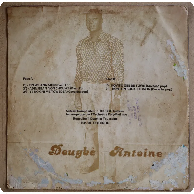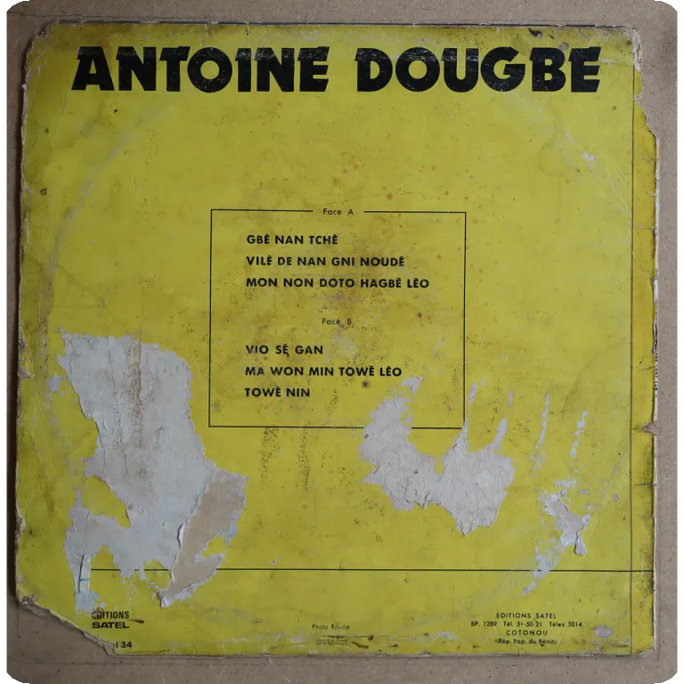 Features the uptempo afro rock / afrobeat track + more sato / agbadja influenced & straight Beninese afro pop tracks. Aging, strong ringwear, ringwwear & small writings on back, small writings on