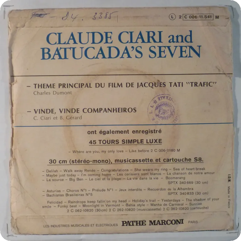 French bossa bova / samba tune. Aging & dirt, bump on mouth & mini tear, sticker on front, rubber stamp on cover, writings on cover & labels.