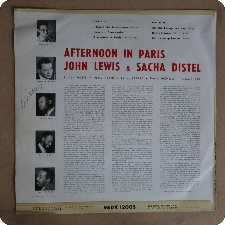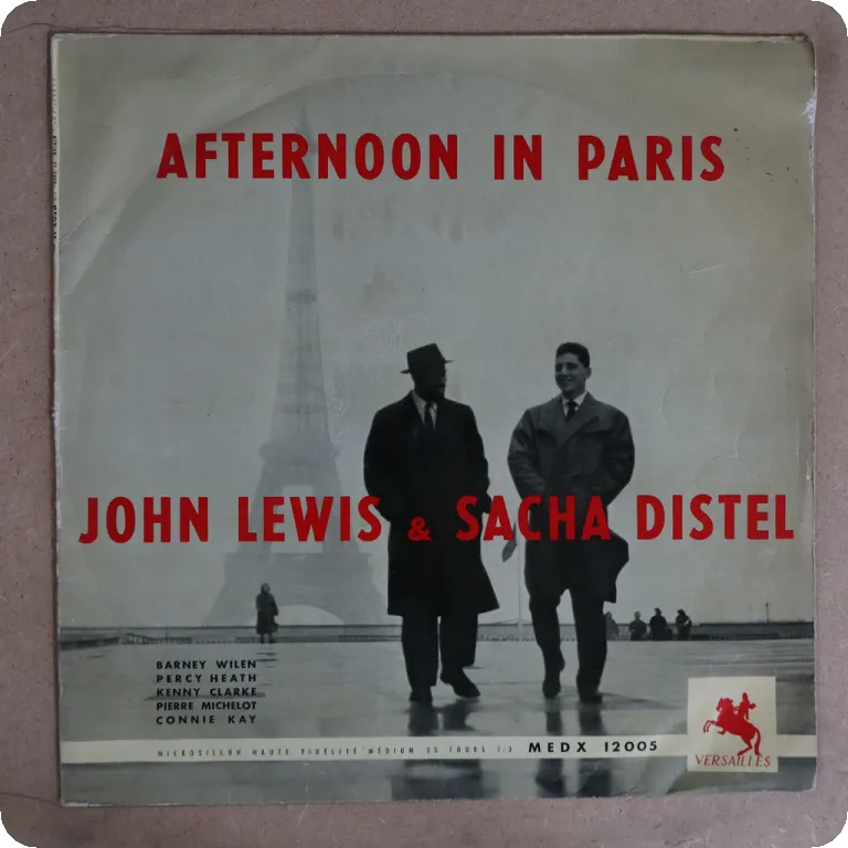 Hard bop led by the MJQ pianist & leader & French guitarist Distel w/ backing by such greats as Barney Willen, Percy Heath, Pierre Michelot & Connie Kay. Sleeve has aging & creases, some warp on