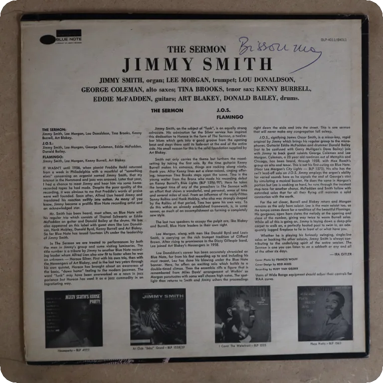 Hard bop classic by the organ virtuoso. Some wear on cover, writing on back, record plays solid VG- to VG+ depending on parts w/ very reasonable to hardly noise depending on parts from marks &