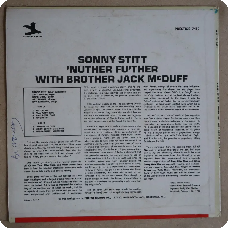 Hard bop on top by the saxophone master on this scarce 1960 Mono second press with "INC" and ©¸ on side 2 label. Otherwise identical to first mono release, no "INC" or ©¸ on side 1, blue and white