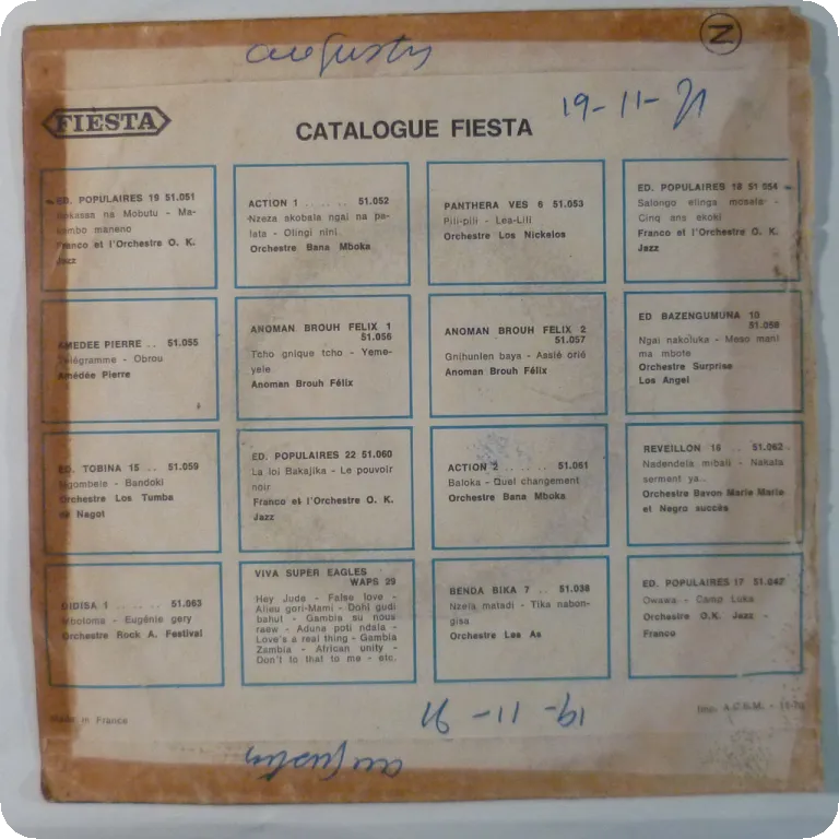 Congolese cha cha cha meeting march rhythm & straight march as recorded by one Congo's legends for the equally legendary label as a tribute to Congo independence. Sleeve w/ dirt & aging, writings on