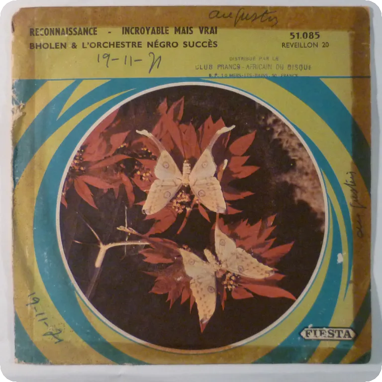 A down tempo son montuno Cuban style and a soul ballad as recorded by this obscure singer apparently from Benin. Sleeve is G w/ bite on top mouth, bump on mouth, writings along top on back.Record is