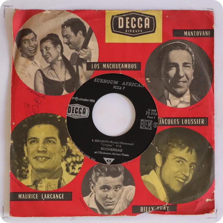 Pachanga on top w/ guitar & flute solo as recorded by the Congolese legends on this scarce original single press. Sleeve has dirt & aging, small bites on spine & mouth & top, few mini peel off, 5"