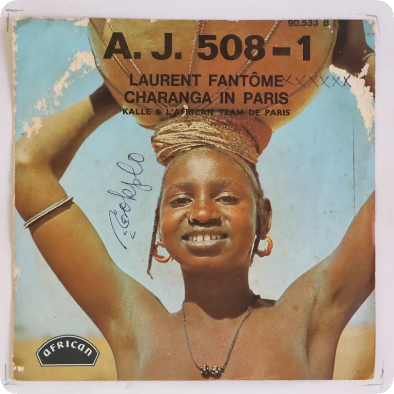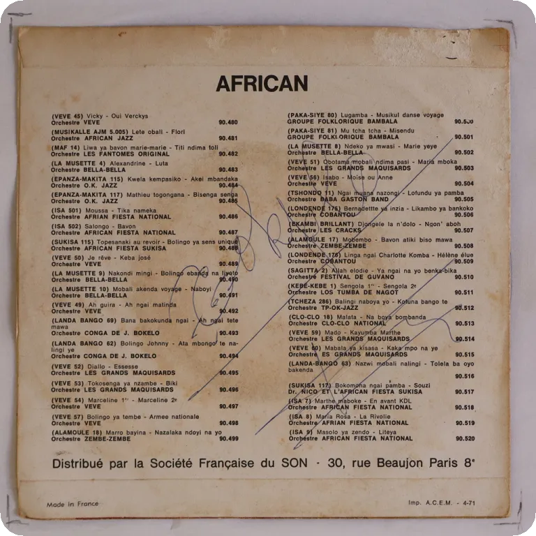 Raw dancefloor instrumental merengue & a sweet bolero sung in french as recorded by the Congolese superstars.Some light wear on cover, writings & dirt on back cover, plays nicely with occasional light