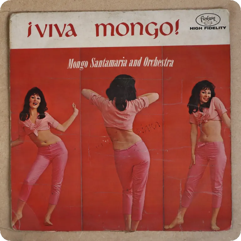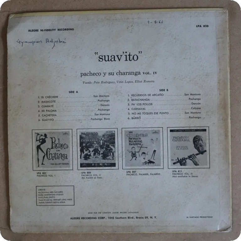 Boogaloo, pachanga & charanga on top as recorded by the Panafrican group. Aging & dirt wear, large brown water damage wear on back, writings on back & labels, 2" tear starting on mouth on back