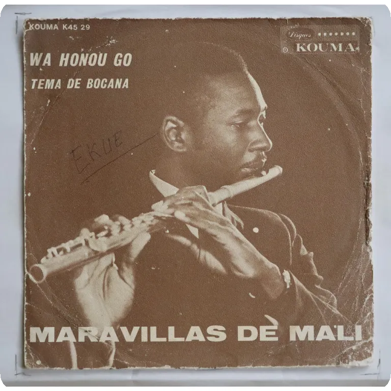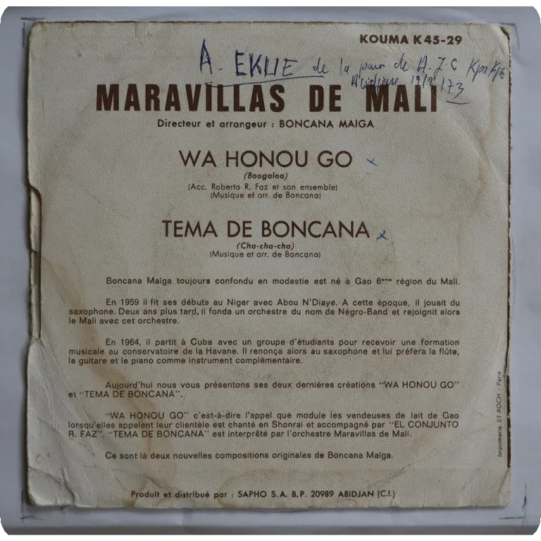 A rarer 7" released by Boncana Maiga's group with A side single only. Wear on cover, bump / creas on mouth, writings on cover & labels, record has light noise from time to time but still a very nice