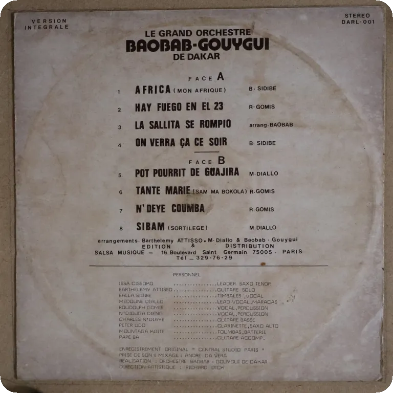 Several latin tracks Senegalese style & a version of their all times classic "On verra ca", surely one of their true masterpieces. Sleeve has minor wear but strong dirt,manufacture misprint fading of