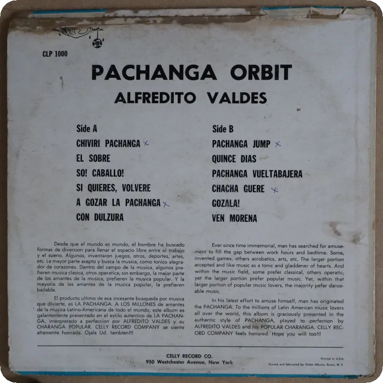 "Chacha guere" "So ! caballo ! " & more excellent pachangas. Sleeve w/ aging & wear, split along all top, 3" split on bottom, writings, air bubble & peel off on back, Record has light to hardly