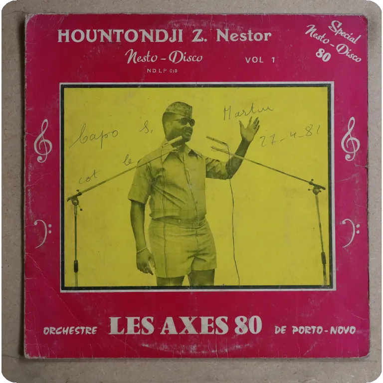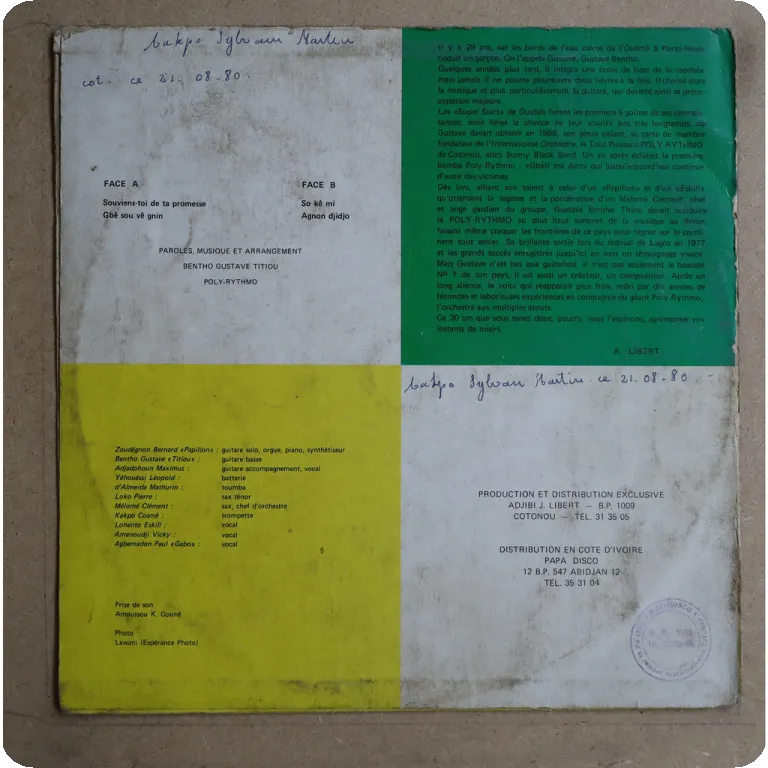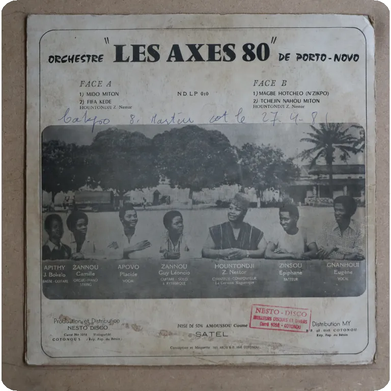 One of the best Beninese salsa tunes ever released & a 2 soukous winners on this only solo LP by Poly Rythmo bass player. Sleeve has aging, dirt, ringwear, writings, 2,5" split on spine, shop stamp on