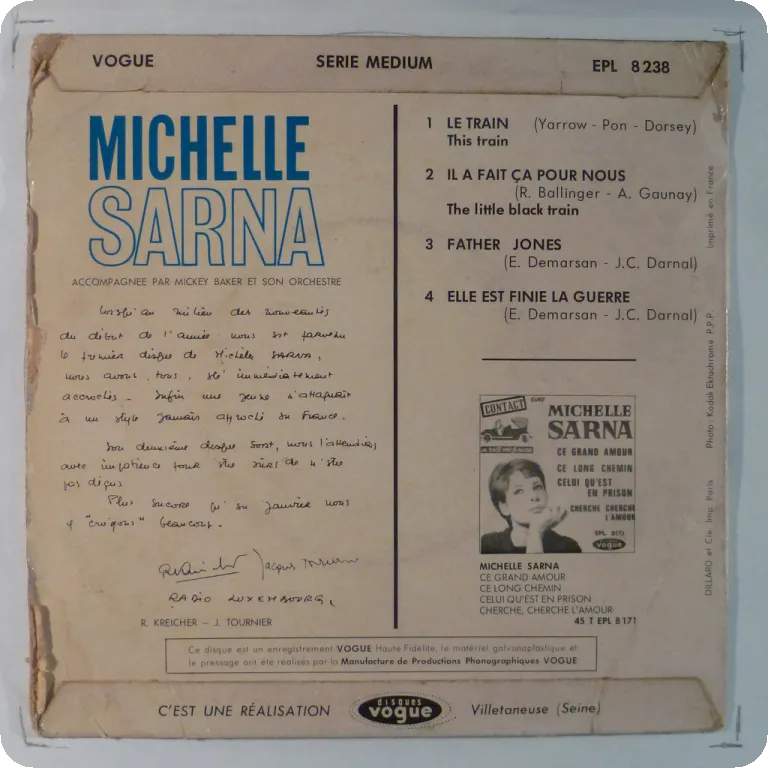 Soul ballad & vocal dixieland on top on this crooner French pop release. Dirt & aging, bite on bottom mouth, writings & ringwear on back. Record has reasonable to very light noise, crackier on the