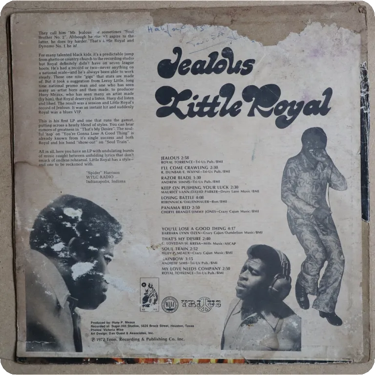 2 instrumental funk & a vocal funk on top on this otherwise bluesy mellow Texas soul LP. Plastic products pressing with no side mentionned on labels. Sleeve has strong aging, dirt, ringwear, large